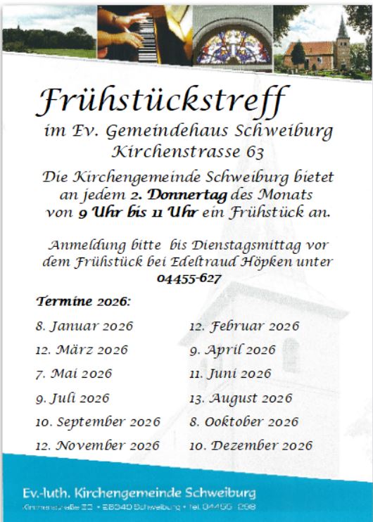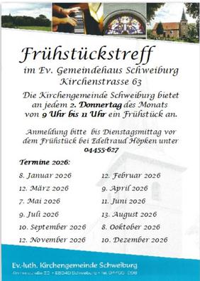 Die Kirchengemeinde Schweiburg lädt an jedem zweiten Donnerstag im Monat von 9:00 bis 11:00 Uhr herzlich zu einem gemeinsamen Frühstück ein.