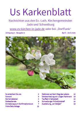Die neue Ausgabe des gemeinsamen Gemeindebriefes "Us Karkenblatt" steht online zur Verfügung. In der Online-Ausgabe sind die biografischen Angaben zu den Geburtstagen und Amtshandlungen (Taufe, Konfirmation,Trauung, Beerdigung) nicht abgedruckt.