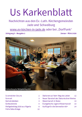 Die neue Ausgabe des gemeinsamen Gemeindebriefes "Us Karkenblatt" steht online zur Verfügung. In der Online-Ausgabe sind die biografischen Angaben zu den Geburtstagen und Amtshandlungen (Taufe, Konfirmation,Trauung, Beerdigung) nicht abgedruckt.
