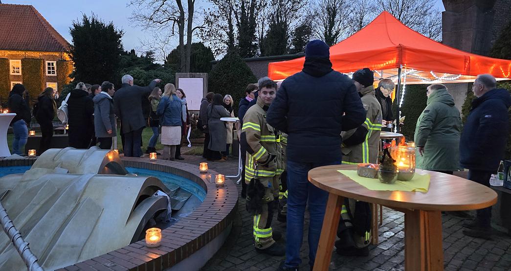 Im Anschluss an die Einführung gab es noch auf dem Nicolaiplatz – der mit Fackeln und Lichtern besonders illuminiert war, die Gelegenheit zum persönlichen Austausch und einen kleinen Imbiss. Mit dabei waren auch Mitglieder der Freiwilligen Feuerwehr Elsfleth.